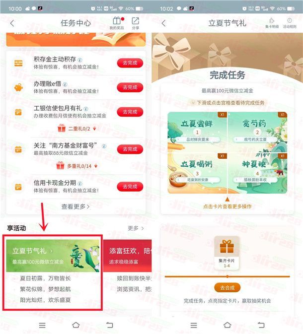 小编提示:打开中国工商银行APP搜索【任务中心】进去,在享活动那里点【立夏节气礼】进去,完成3个简单的浏览任务和1个转账2.4元的任务后,可以集卡合成抽奖,非必中