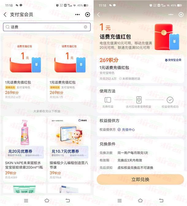 这是支付宝会员中心积分兑换话费红包的活动,有中国电信手机号码的可以去(移动和联通手机号码自测),通过打开支付宝APP进去会员中心用269个积分兑换1元话费红包,兑换后再去“中国电信”APP,在APP里可以自定义金额充值1元话费,支付方式选择支付宝就可以用1元红包抵扣,实测0元充1元电信话费。