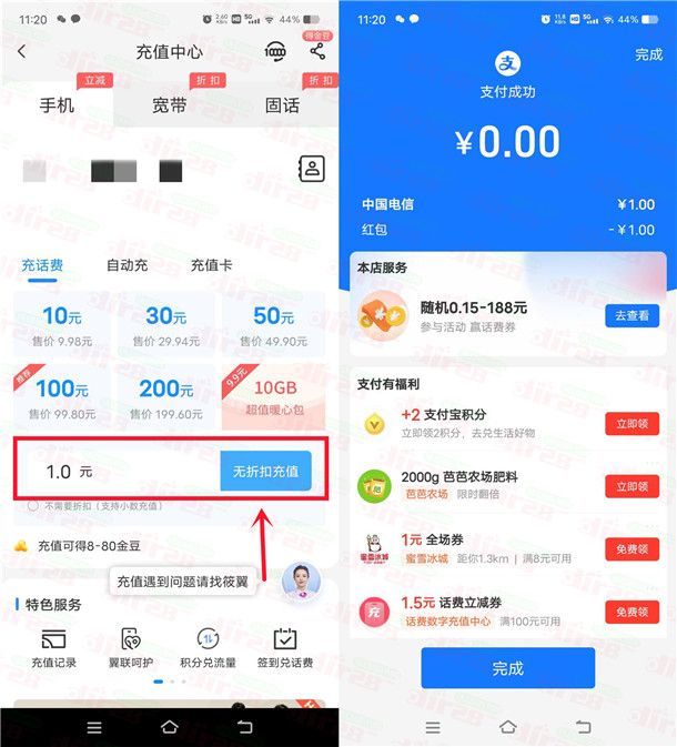 2、兑换后再打开“中国电信”APP,在APP里可以自定义金额充值1元话费,支付方式选择支付宝就可以用1元红包抵扣,实测0元充1元电信话费(移动和联通手机号码可以去对应的APP里自测,小编没有测试移动和联通号码)