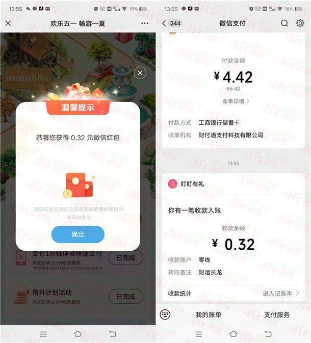 小编提示:进去直接下拉到底完成4个任务抽奖(3个浏览任务和1个用微信绑定的中国银行卡支付0.01元的任务),得到40km里程后可以点击牌子抽奖2次,刚中0.32元红包,非必中