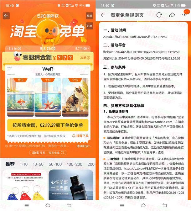 参加淘宝举办的5.10周年庆赢免单活动,通过打开淘宝APP搜索【淘宝免单】进去活动里,每天有3场活动,分别为每天11点、16点、21点(如果时间有变动以活动页面显示的为准),先猜金额,比如当天场次的金额答案为21元,就在指定时间点购买21-21.99元的商品,购买的商品不能用任何红包,必须要实付款,如果中到免单就会得到一个指定金额的无门槛红包。