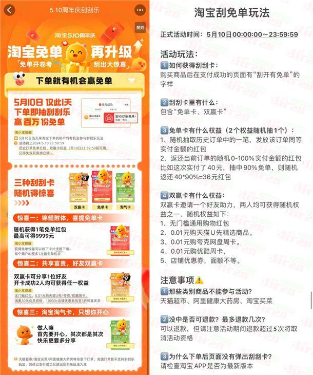 淘宝5.10周年庆刮刮乐抽百万份免单红包 全天可抽非必中