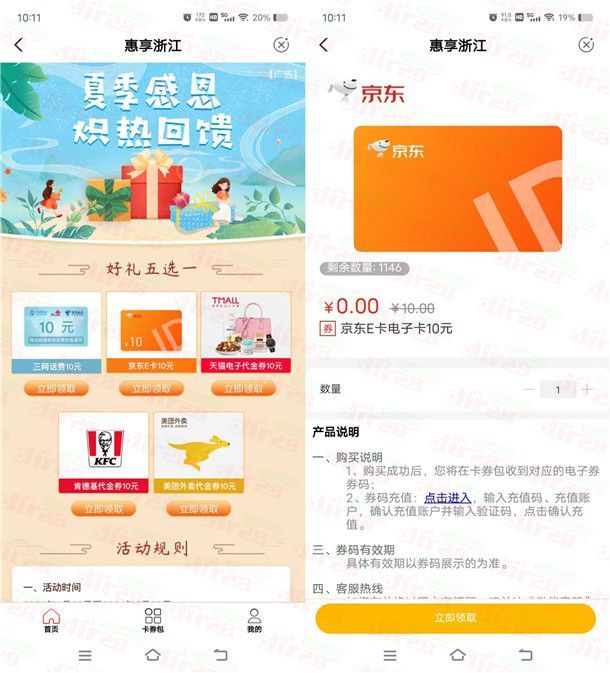 小编提示:这个活动全国都可以去,只有部分用户才可以领,能参加的可以五选一0元领取,我自己也不是浙江的,亲测刚0元领了10元京东卡,数量限量