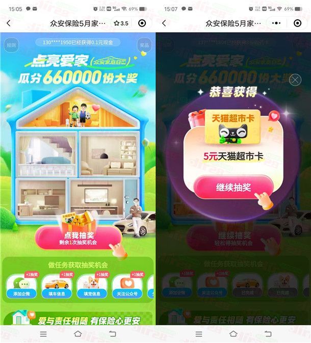 参加众安保险举办的点亮爱家瓜分660000份大奖活动,通过打开微信进去小程序活动里,完成页面指定的任务可以获得多次抽奖机会(车辆信息的任务填没车就行),有机会中到5元天猫超市卡、实物,只有中到天猫超市卡和实物才有用,天猫超市卡可以自用也可以出售卖给别人,非必中。