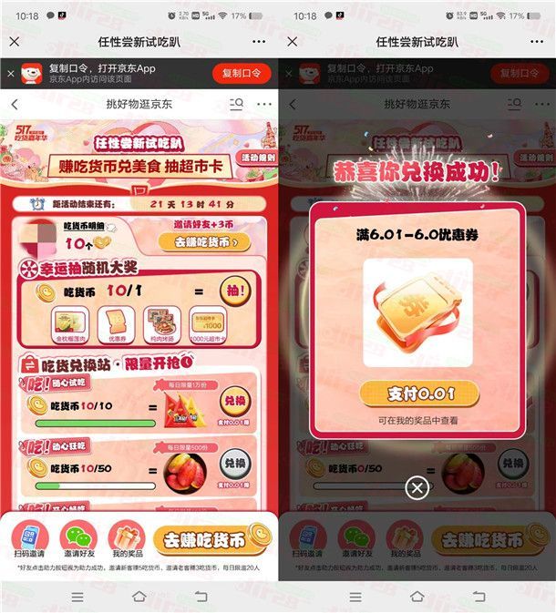 参加京东举办的任性尝新试吃趴活动,通过打开京东APP进去活动里,完成页面指定的浏览任务可以领到多个吃货币,只要累积领到10个吃货币后就可以兑换6元券(满6.01元使用),兑换后就可以去购买6.01元零食抵扣6元,等于只需0.01元就可以购买零食。