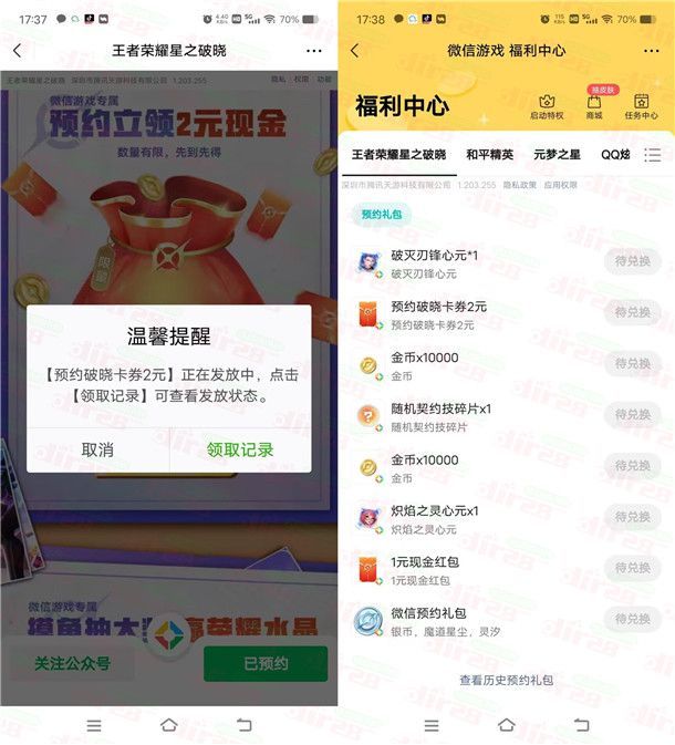参加王者荣耀星之破晓举办的微信手游预约领2元红包活动,通过打开微信进去活动里,进去预约游戏就可以领取到2元微信红包卡券,如果之前预约过的就先取消预约,再在活动里点击顶部的预约按钮(要点顶部的预约按钮),领到的红包以卡券的形式到账,手游上线后可以在微信福利中心兑换领取。