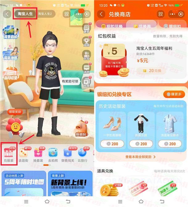 小编提示:打开淘宝APP搜索【淘宝人生2】进去,先点左上角切换“淘宝人生”,再点“兑服装”进去,下拉页面完成指定的任务得兑换券,累积20个兑换券可以兑换5元天猫超市卡