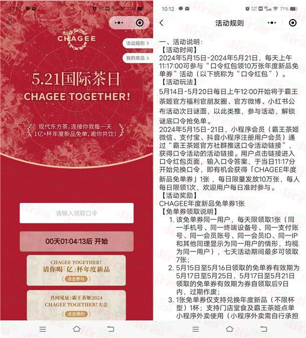霸王茶姬的另外一个抢免单券的活动,通过打开微信进去小程序活动里,每天上午11:17分开始,填写当天正确的口令就可以抢免单券,每天限量10万份免单,抢到免单券可以在霸王茶姬免费喝一杯奶茶,这个活动必须要准时去才能抢。
