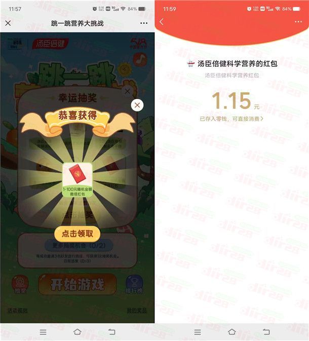 参加汤臣倍健举办的跳一跳营养大挑战游戏抽红包活动,通过打开微信进去活动里,每日单局游戏达到100分可以抽奖1次(游戏期间最多可抽8次),每日首次集齐九大图鉴还可以额外抽1次(游戏期间最多可额外抽8次),可以反复玩,有机会中到1-100元微信红包、实物,小编测试中到1.15元红包,非必中。