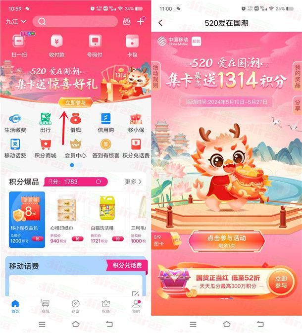 和包520爱在国潮集卡领最高1314个积分 价值13元左右