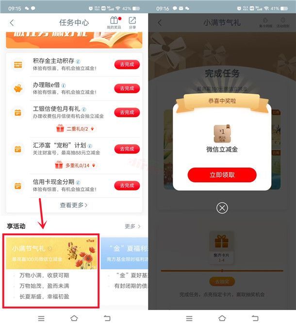小编提示:打开中国工商银行APP搜索【任务中心】进去,在享活动那里点【小满节气礼】进去,完成3个简单的浏览任务和1个转账2.4元的任务就可以合成抽奖1次,刚中1元微信立减金,非必中
