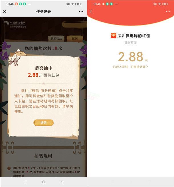南网在线时光来信小游戏抽2.88-18.88元微信红包 亲测中2.88元