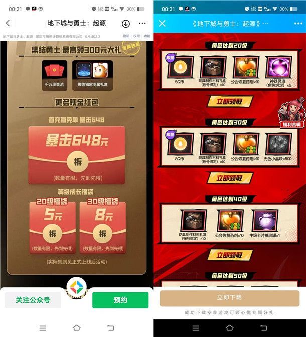 参加地下城与勇士:起源举办的手游震撼首发下载练级领红包Q币活动,通过打开微信和手机QQ进去活动里,首次下载注册游戏并且等级达到20级可以领到5元微信红包、5个Q币,等级达到30级还可以领到8元微信红包、8个Q币,完成其他等级要求和邀请好友还可以领红包和Q币,每个档位的红包和Q币数量限量。
