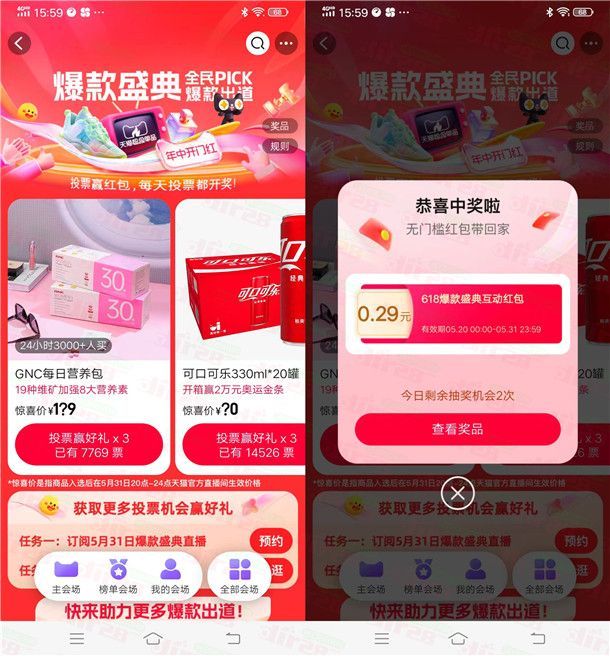 参加淘宝举办的爆款盛典投票赢红包活动,通过打开淘宝APP进去活动里,每天都有3次投票机会,每次投票后就会自动抽奖1次,有机会中到随机金额的淘宝无门槛红包,小编测试中到0.29元,这个活动每天都可以去抽一下,积少成多,可以跟所有淘宝无门槛红包一起叠加无门槛抵扣。