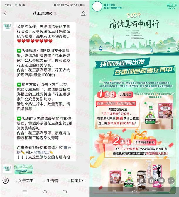 参加花王理想家微信公众号举办的清洁美丽中国行邀友助力送实物奖励,通过打开微信关注公众号【花王理想家】获取分享海报二维码,分享好友助力就可以参加,分享5个好友助力可领取花王蒸汽眼罩、花王衣物护理喷雾(限量1000份),另外邀请人数最多的前10名还将额外获得花王送出的2重清美先锋好礼(内含:花王蒸汽眼罩、家庭清洁套装和花王泡泡染发剂等)。