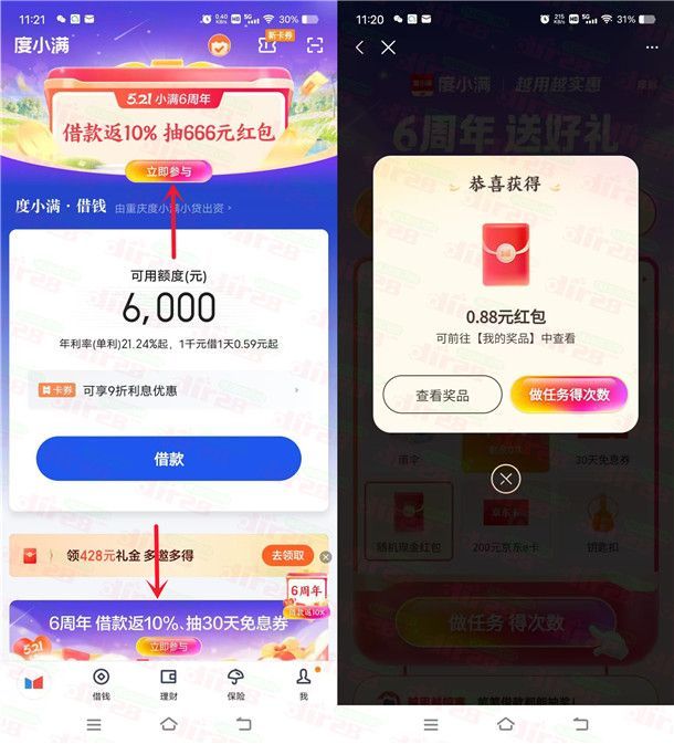 度小满金融6周年活动抽最高666元现金红包 亲测中0.88元