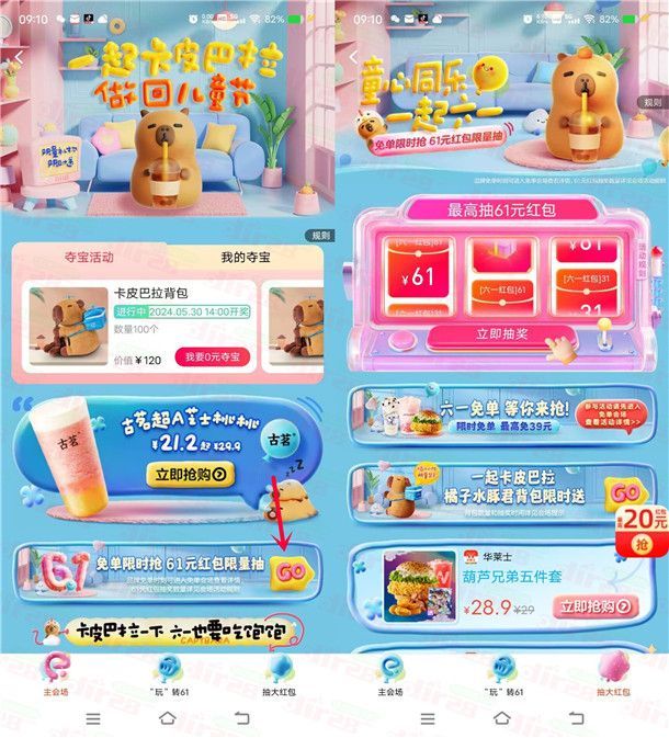 参加饿了么举办的童心同乐六一免单限时抢活动,通过打开饿了么APP搜索【豚门】进去活动里,每个人可以抽奖1次,有机会中到11-61元外卖红包,中到的外卖红包可以在饿了么点外卖抵扣使用(比如中到11元外卖红包满12元使用),非必中。