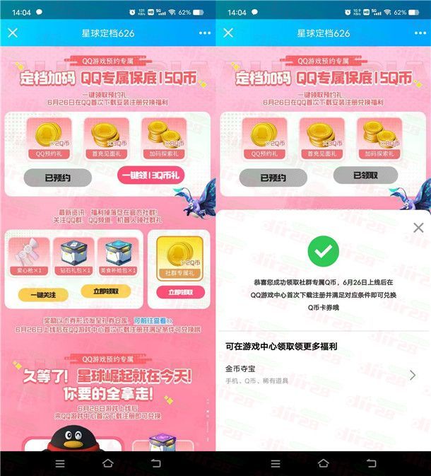 小编提示:一键预约游戏可以领到15个Q币,一键加群和加入频道还可以领到2个Q币,领到的Q币以卡券的形式到账,在6月26日手游上线后可在手机QQ礼券仓库里兑换领取