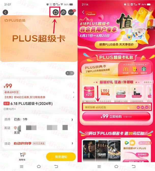 这是京东618的一个限时低价开京东会员的活动,需要京东会员的可以去,按照小编下面写的流程参加,先进去收藏一个京东PLUS会员商品的链接,然后再进去活动里,会提示额外送60元或者80元京东无门槛红包,再加上原本开京东会员送的20元京东无门槛红包,等于最少送80元京东无门槛红包,有的甚至会送100元京东无门槛红包。