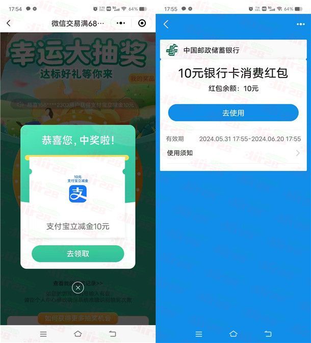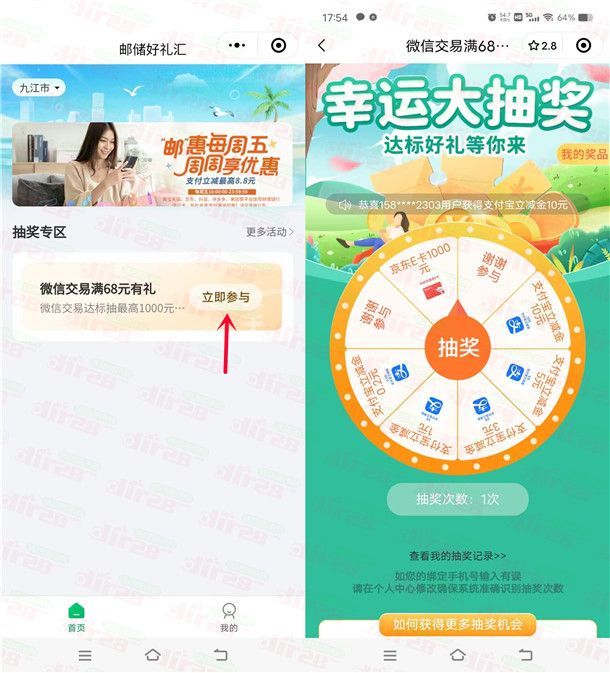 邮储好礼汇之前也举办过多次类似的活动,参加过的也可以继续去,通过打开微信进去小程序活动里,只要微信交易用邮储银行卡满68元可以获得抽奖次数,达标多次可以抽多次,小编测试中到10元支付宝红包秒到支付宝卡包里,非必中。