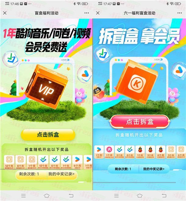 参加联通举办的六一福利盲盒拆盲盒拿会员活动,这个活动三网手机号码都可以去,通过打开微信进去活动里,进去登录后就可以抽奖1次,有2个活动都可以抽,有机会中到QQ超级会员、酷狗会员、优酷会员,只有中到单会员才有用,中到会员+话费的没用,非必中。