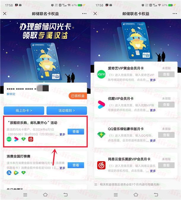 邮储闪光卡放粽欢乐购领爱奇艺会员、优酷会员、网易云音乐月卡