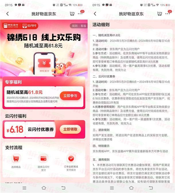 参加京东联合云闪付举办的锦绣618领6.18元云闪付优惠券活动,通过打开京东APP进去活动里,每天上午10点整开始,可以直接领到6.18元云闪付优惠券,每天限量,领到券后可以在京东APP购买实物类商品及话费充值,使用云闪付支付就可以抵扣。