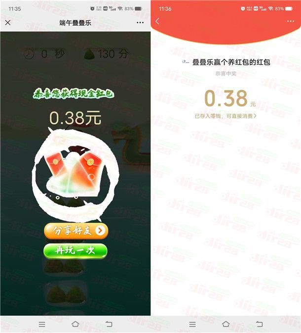 小编提示:每天3次游戏机会,点击屏幕跳跃叠粽子,小游戏达到100分抽奖,刚中0.38元,非必中