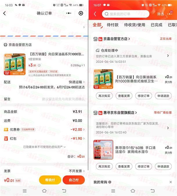 京东简单0.01元撸悬挂抽纸1提包邮 可多次参加
