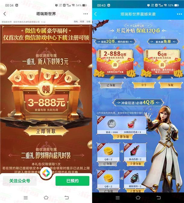 塔瑞斯世界是今天新上线的腾讯游戏活动,今天预计会有多个微信端、QQ端、以及其他渠道的活动可以参加,通过打开微信和手机QQ进去活动里,下载游戏首次注册登录可以领取到3-888元微信红包、2-888个Q币,完成等级和其他要求还可以领取红包和Q币,每一个档位的红包和Q币数量限量。