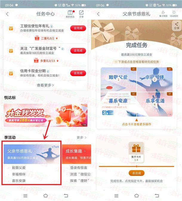 小编提示:打开中国工商银行APP搜索【任务中心】进去,在享活动那里点【父亲节感恩礼】进去,完成3个简单的浏览任务和1个切换幸福生活版的任务就可以合成抽奖1次,非必中