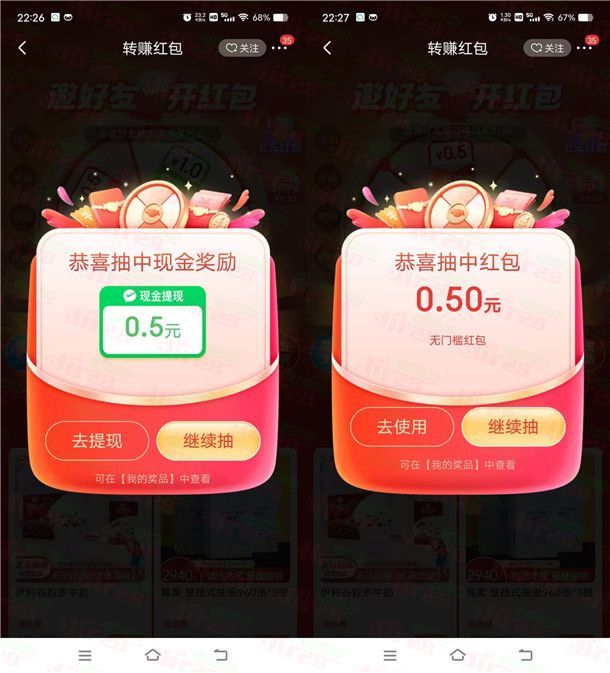 参加京东举办的转赚红包活动,通过打开京东APP进去活动里,进去有多次抽奖机会,每次都有机会中到随机金额的微信红包、或者京东无门槛红包,机会用完可以做任务加次数,小编测试中到0.5元京东无门槛红包+0.5元微信红包,如果中到微信红包需要点击左侧“奖品”进去手动提到微信。