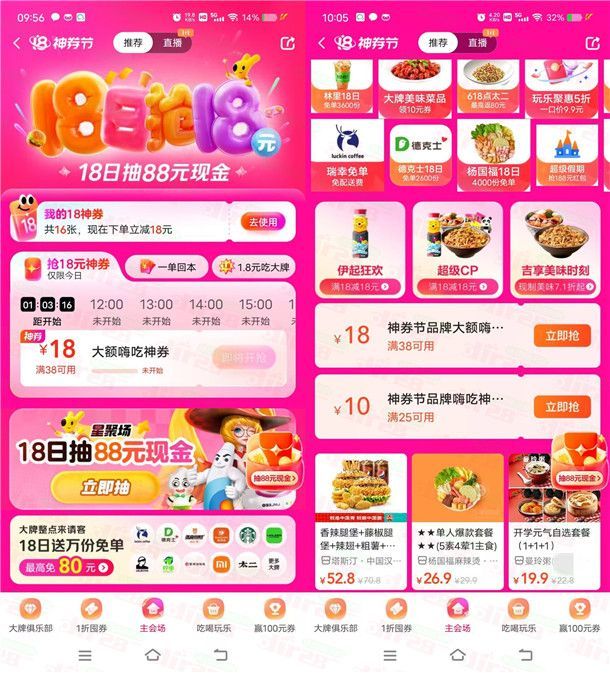 18-88元现金红包、满38减18元、满25减10元外卖券