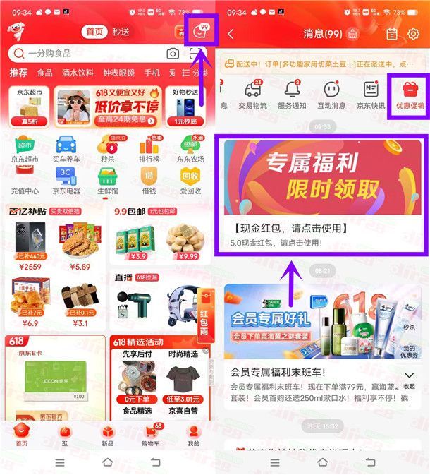 小编提示:打开京东APP点击右上角消息图标,左右滑动找到【优惠促销】点击进去,如果看到【专属福利限时领取】的消息就点击进去就可以领到3-8元无门槛红包(点进去会有弹窗提示获得红包),并非每个人都有