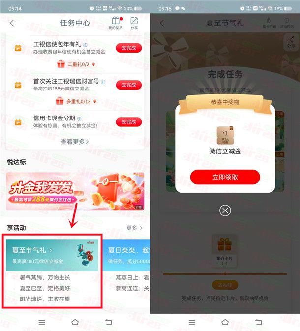 工商银行夏至节气礼活动抽1-100元微信立减金 亲测中1元