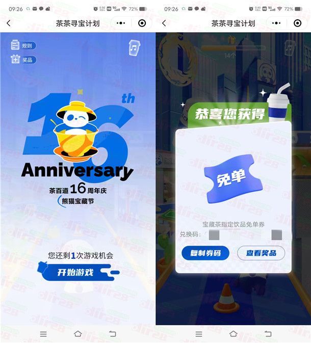 茶百道茶茶寻宝小游戏抽6.6万份奶茶免单 亲测中1份奶茶免单