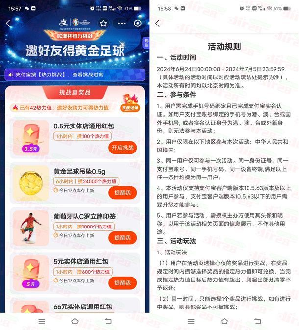 支付宝欧洲杯热力挑战领0.5-100元支付宝通用红包 亲测秒到