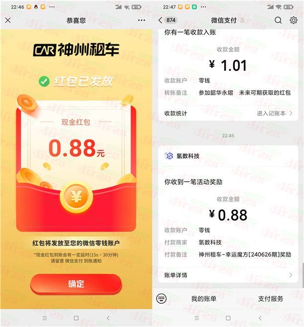 参加神州租车举办的幸运魔方抽红包活动,通过打开微信进去活动里,登录后每个人可以抽奖1次,有机会中到0.18-1.28元随机不等的微信红包,小编测试中到0.88元,中到红包需要按照提示进去神州租车微信小程序里登录一次再返回来领取就会推送,非必中。