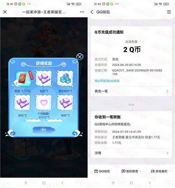 参加王者荣耀举办的一起来冲浪王者夏日福利活动,通过打开手机QQ进去活动里,进去先绑定角色区服,然后再开启任务(每个人的任务不同,有的是登录游戏任务、有的需要完成对局),完成任务后可以领取多次抽奖机会,有机会中到0.77-77.77元现金红包,小编测试中到1.77元秒到QQ钱包余额里,非必中。