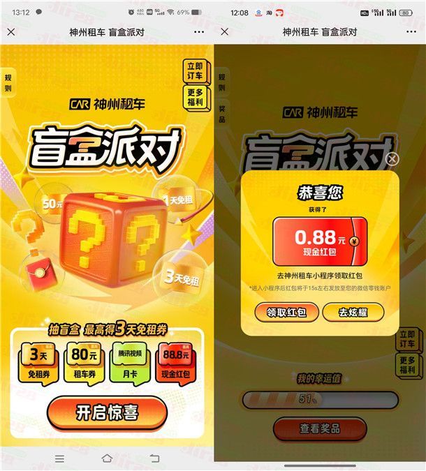 神州租车盲盒派对开惊喜抽0.18-1.28元微信红包 亲测中0.88元