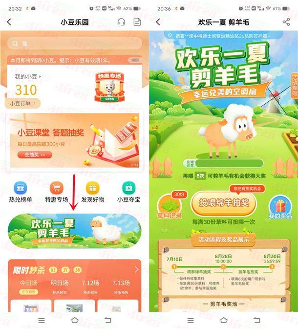 小编提示:打开中国农业银行APP,在【我的】页面点【小豆】进去,再点中间滚动图【欢乐一夏剪羊毛】进去,完成指定的任务得草料,每30份草料可以投喂绵羊并抽奖1次,非必中