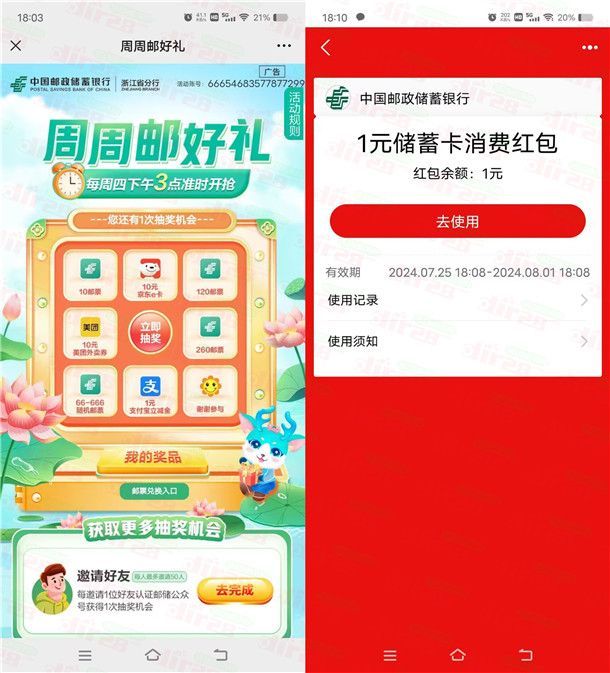 邮储银行周周邮好礼抽1元支付宝红包、10元京东卡 亲测中1元