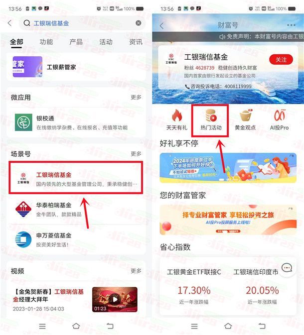 小编提示:打开中国工商银行APP搜索【工银瑞信基金】进去场景号里,点击【热门活动】进去,里面4个活动都可以去,完成浏览和关注任务抽,刚中0.6元现金红包(3个0.2元),需要有工行一类卡才可以参加(二类卡不行)