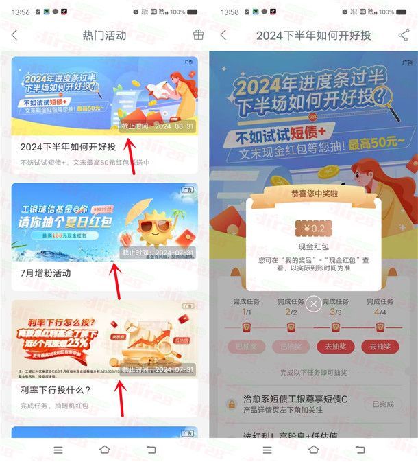 这是工行APP里工银瑞信的几个简单的活动,需要有中国工商银行一类卡才可以参加(二类卡不行),通过打开中国工商银行APP搜索“工银瑞信基金”进去场景号里,点击“热门活动”进去,里面4个活动都可以去,完成浏览和关注任务抽,小编测试中到0.6元现金红包(3个0.2元)。