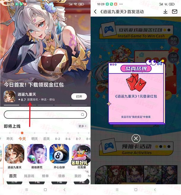 2、打开“九游”APP,首页点顶部滚动图【逍遥九重天】进去,下载游戏安装后,再重新进去活动里就可以抽奖1次,刚中1元,秒到支付宝,数量限量