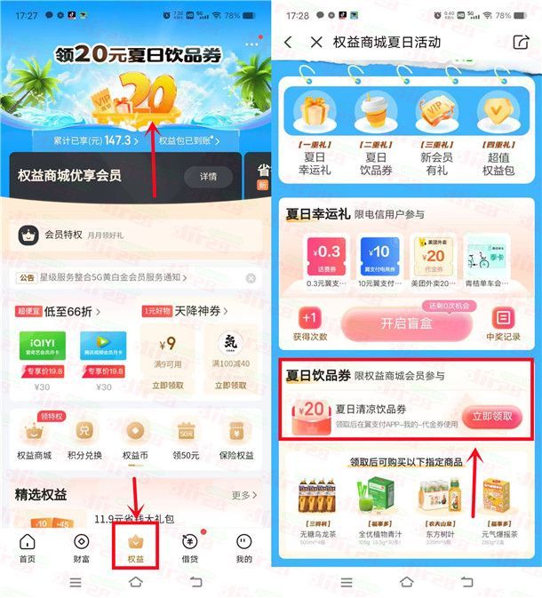 小编提示:打开翼支付APP,点底部【权益】再点顶部【领20元夏日饮品券】进去,下拉页面可以领到20元饮品券,可以用券0元撸牛奶、饮料,数量限量,好像需要之前0.69元购买过翼支付优享会员月卡的才可以领取,夏日幸运礼的活动也可以顺便抽一下,中到话费券也可以自定义金额充电信话费