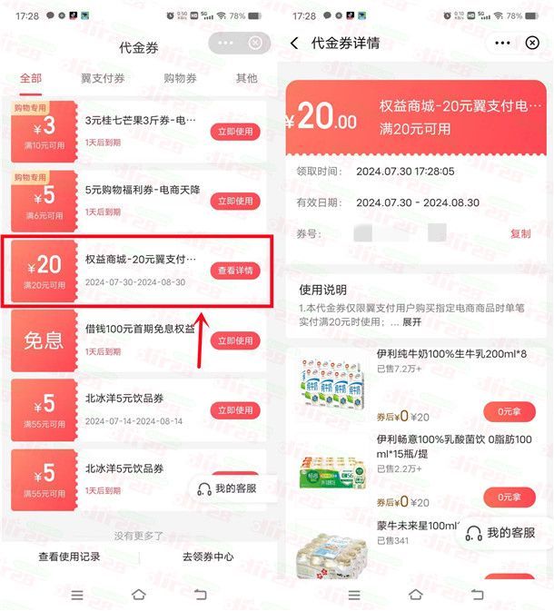 电信翼支付的一个0元撸牛奶饮料的活动,好像需要开通过权益会员的才可以(也就是之前小编发布过的0.69元购买翼支付优享会员月卡的活动),通过打开翼支付APP进去活动里,可以领到20元饮品券,领到券后可以0元撸牛奶、饮料,数量限量。