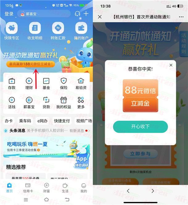 杭州银行开通微信动账通知抽3-188元微信立减金 亲测中88元