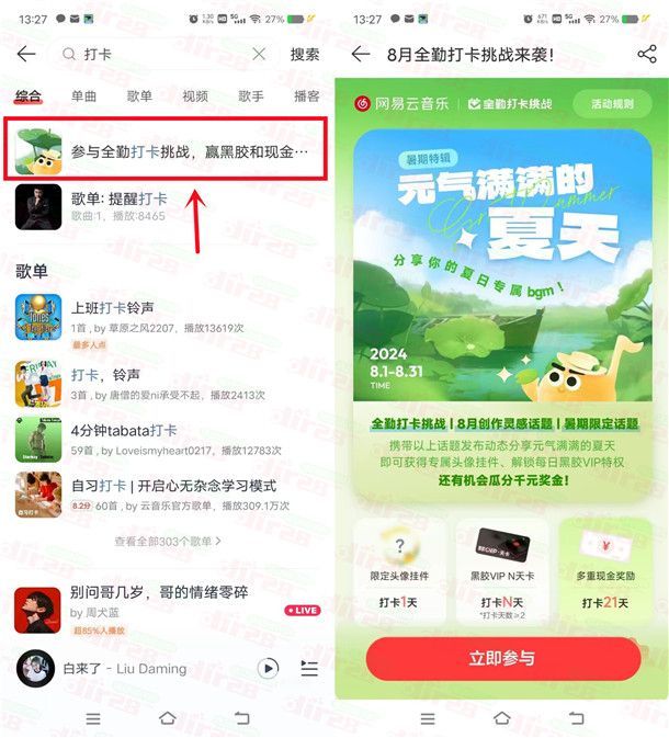 小编提示:打开“网易云音乐”APP搜索【打卡】进去全勤打卡挑战活动里,每天按照提示发布图文动态打卡,本月打卡多少天,下个月就可以领多少天网易云音乐黑胶会员