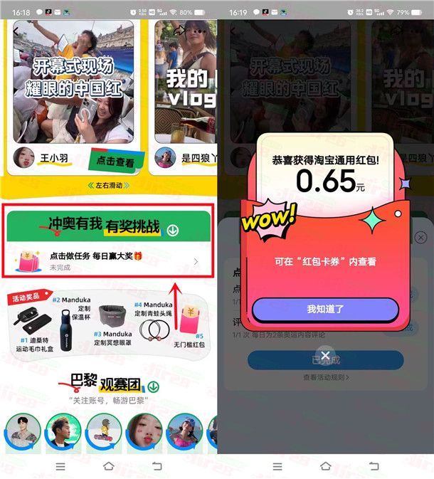 小编提示:打开淘宝APP搜索【巴黎观赛日记】进去,下拉页面点【冲奥有我有奖挑战】完成2个简单的任务抽奖,刚中0.65元淘宝无门槛红包,每天都可以抽1次